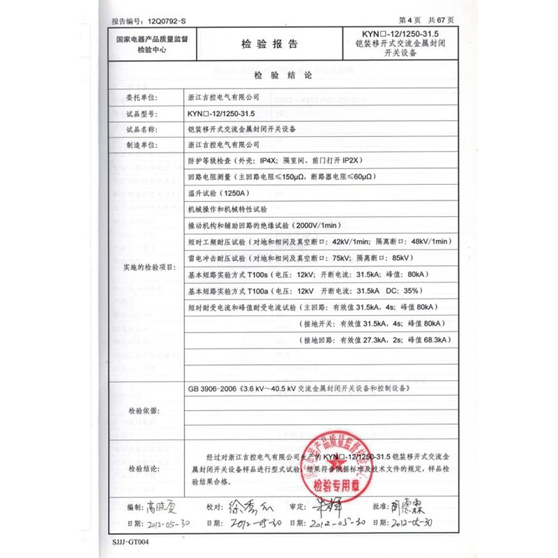 戶內(nèi)交流箱型固定式金屬封閉開關設備檢驗報告